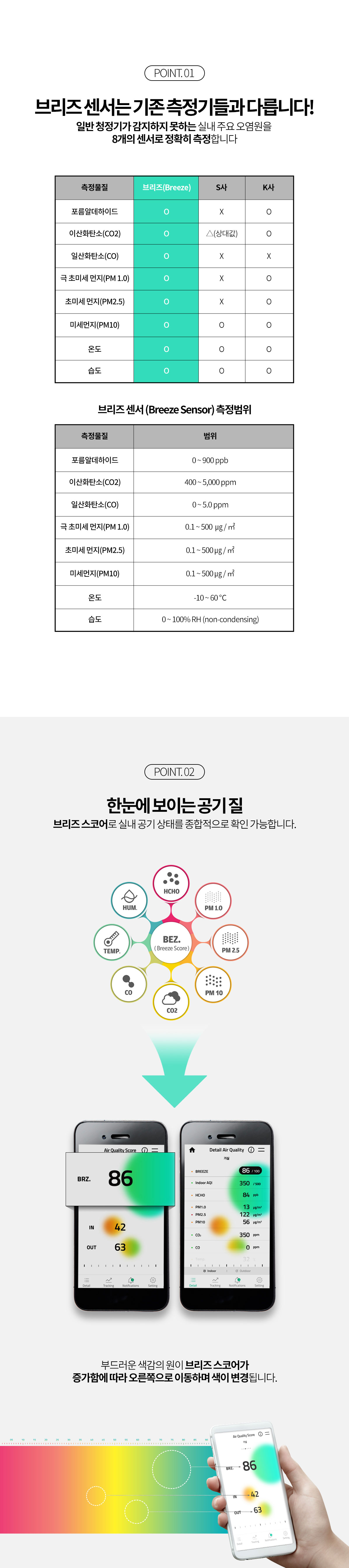 8개의 센서가 탑재되어 사용자가 머물고있는 실내 및 실외의 공기질을 스마트폰 Breeze 전용 APP 을 통해 알려줍니다.