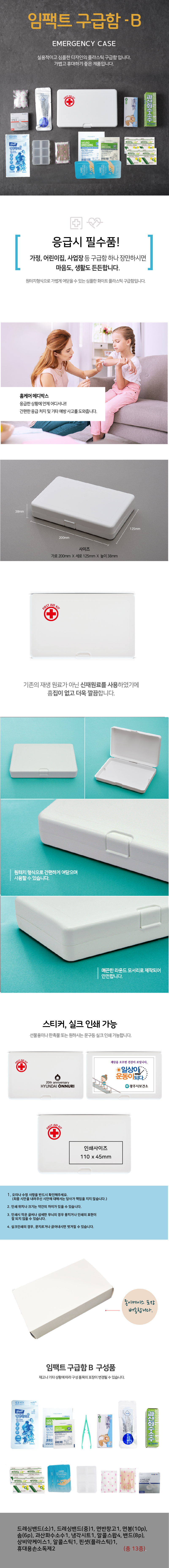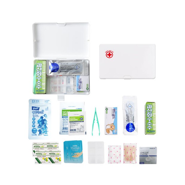 드레싱밴드1,핀셋,반창고1,면봉10p,과산화수소수1,거즈붕대1,알콜스왑4,밴드8p,상비약케이스,알콜스틱1
