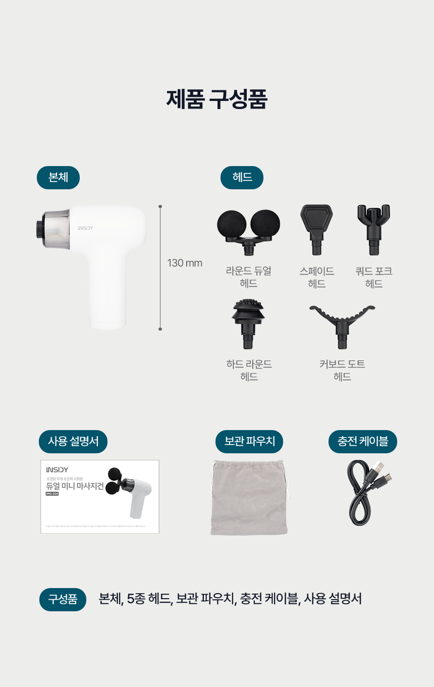 본품, 헤드 5종, 사용설명서, 충전케이블, 전용 파우치