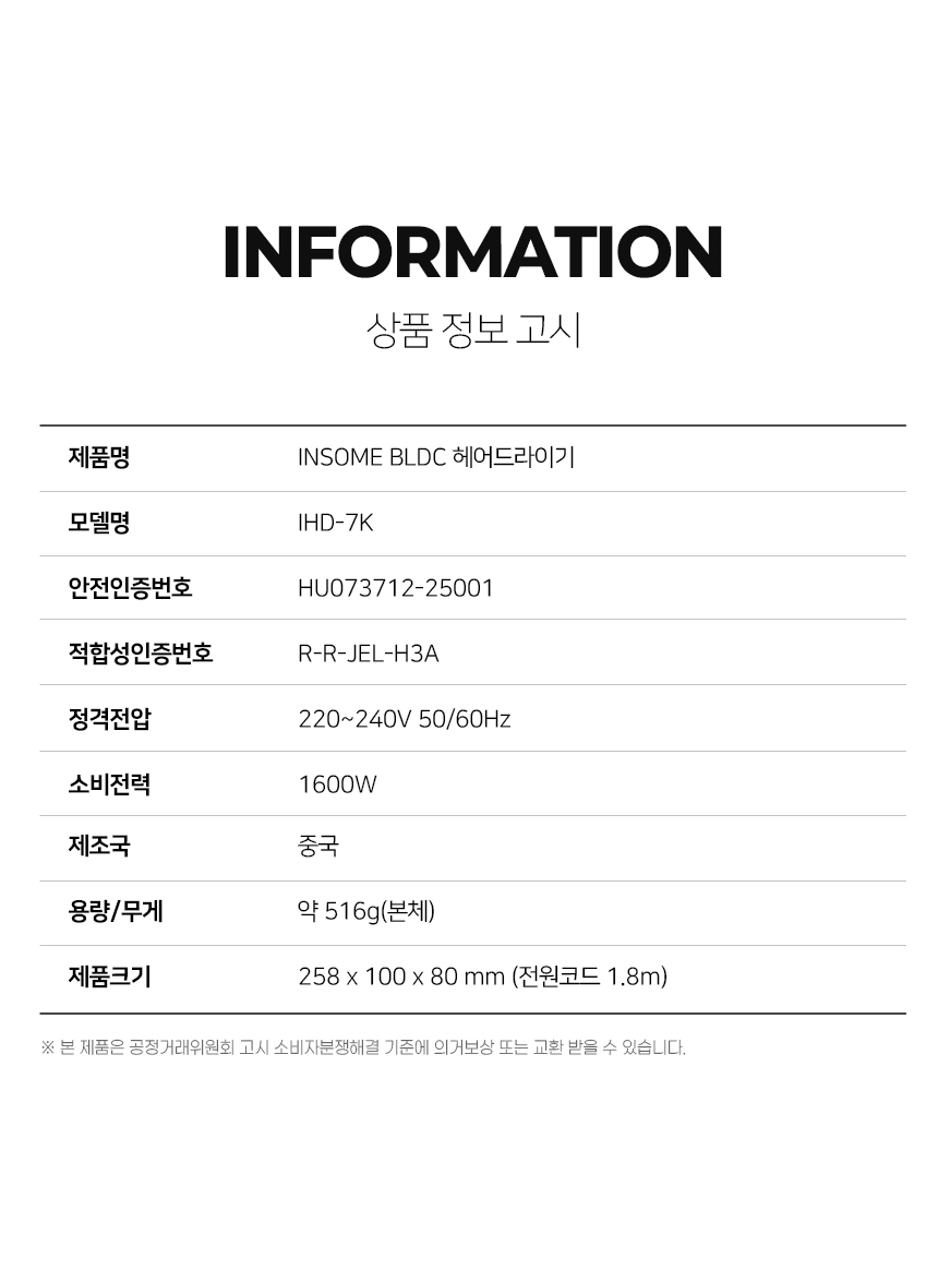 약 516g (본품) 258x100x80(mm) 전원코드 1.8m 220-240V~, 50-60Hz / 1600W