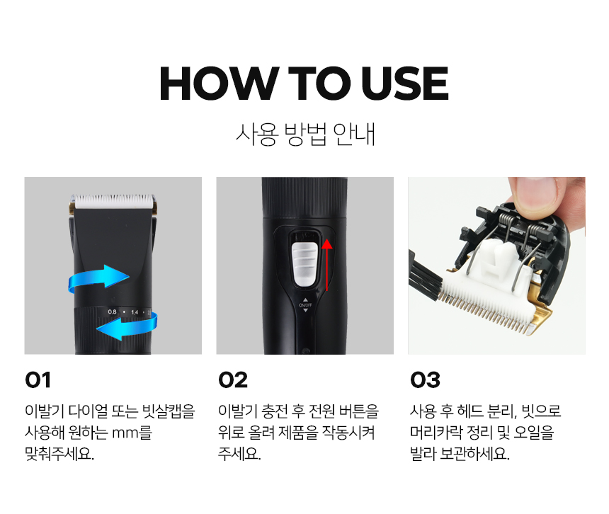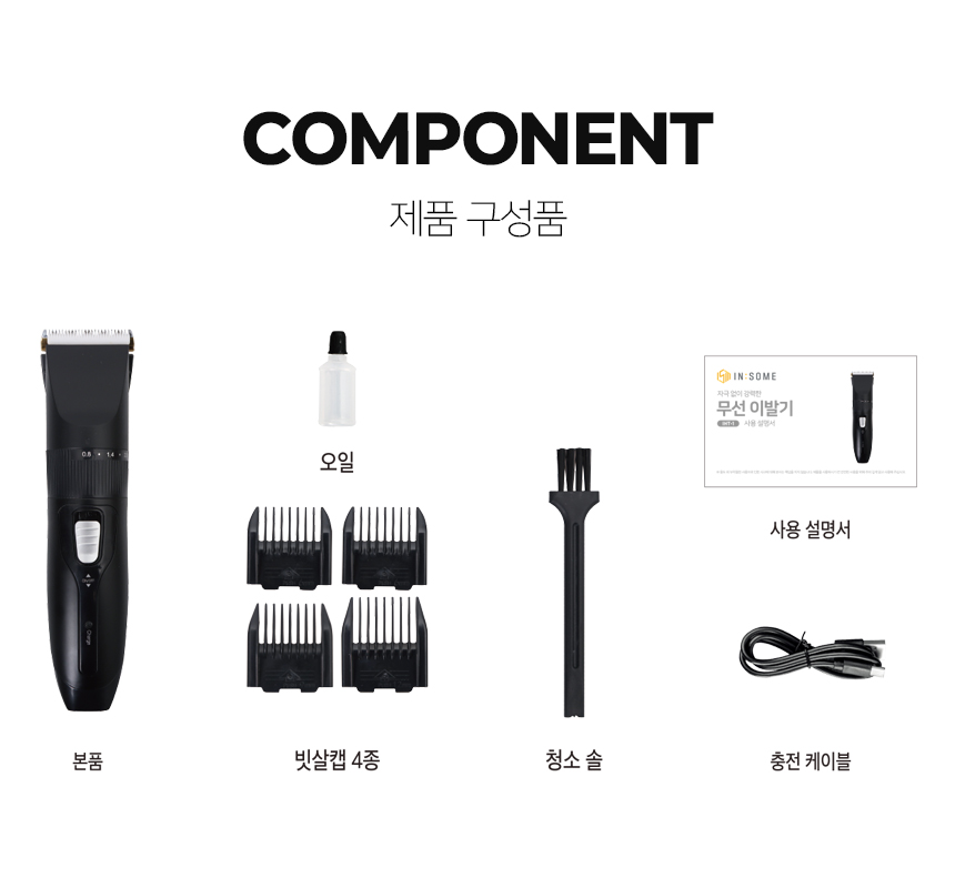 본품, 4종 빗살캡, 청소솔, 오일, 충전케이블, 사용설명서