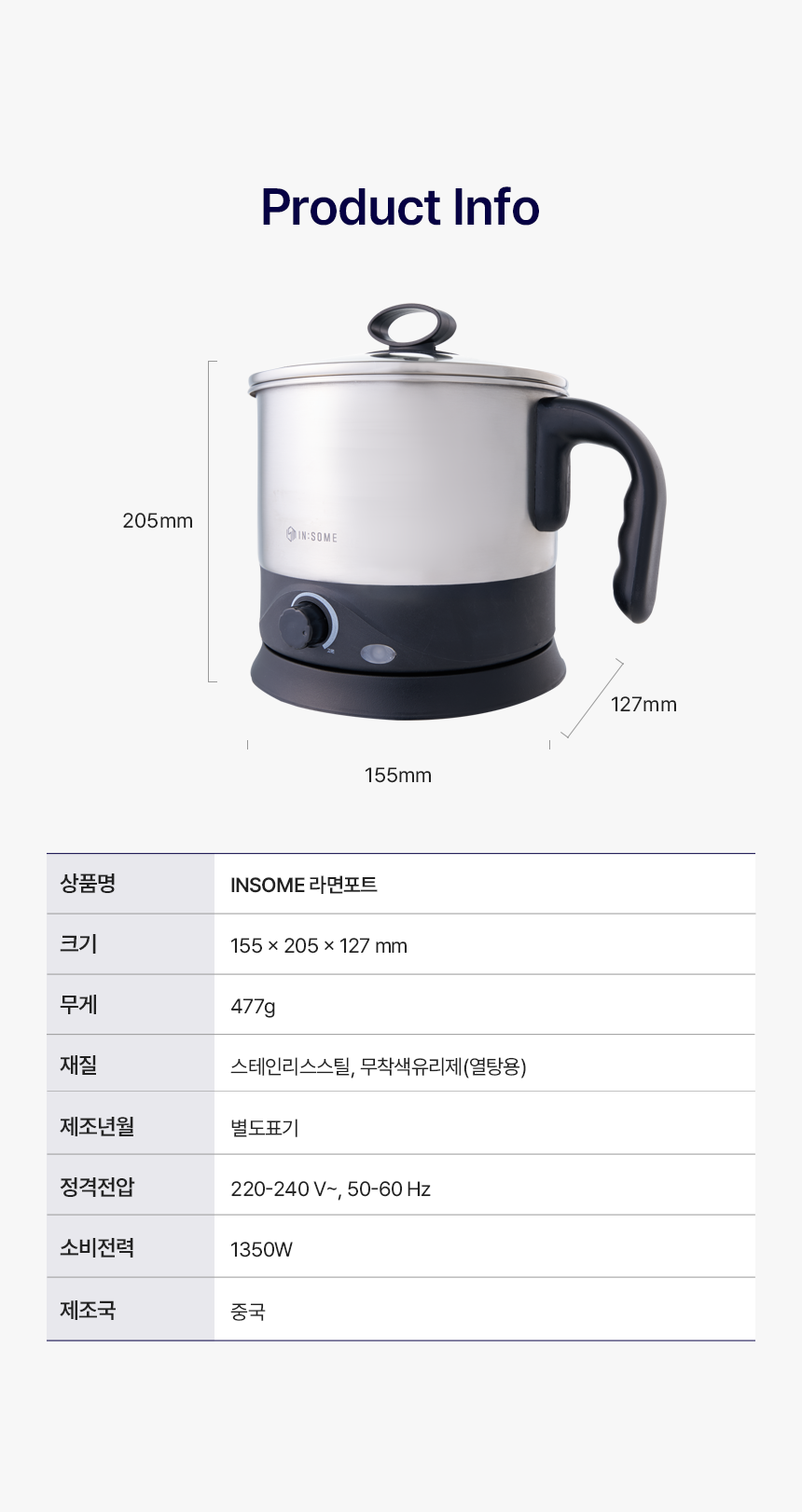 약 477g (본체) 155 x 205 x 127 (mm) 220-240 V~, 50-60Hz / 1350W