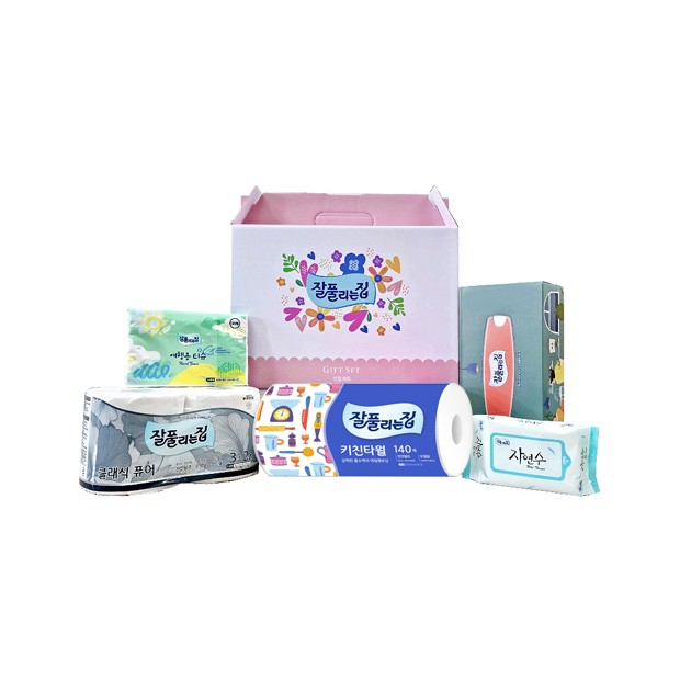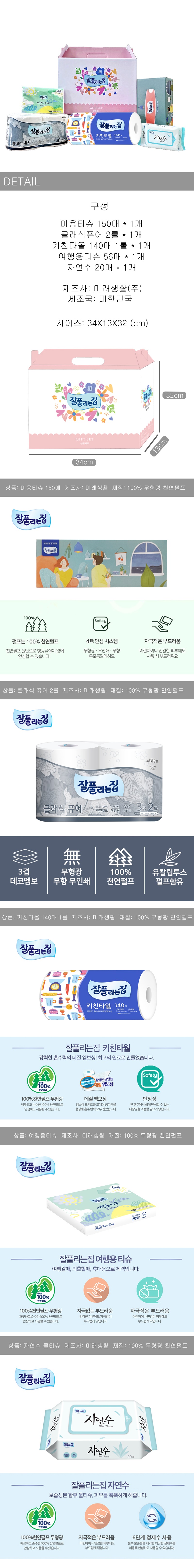 미용티슈 150매 1개. 클래식퓨어(화장지) 2롤 1개. 키친타올 140매 1롤 1개. 여행용티슈 56매 1개. 자연수(물티슈) 20매 1개