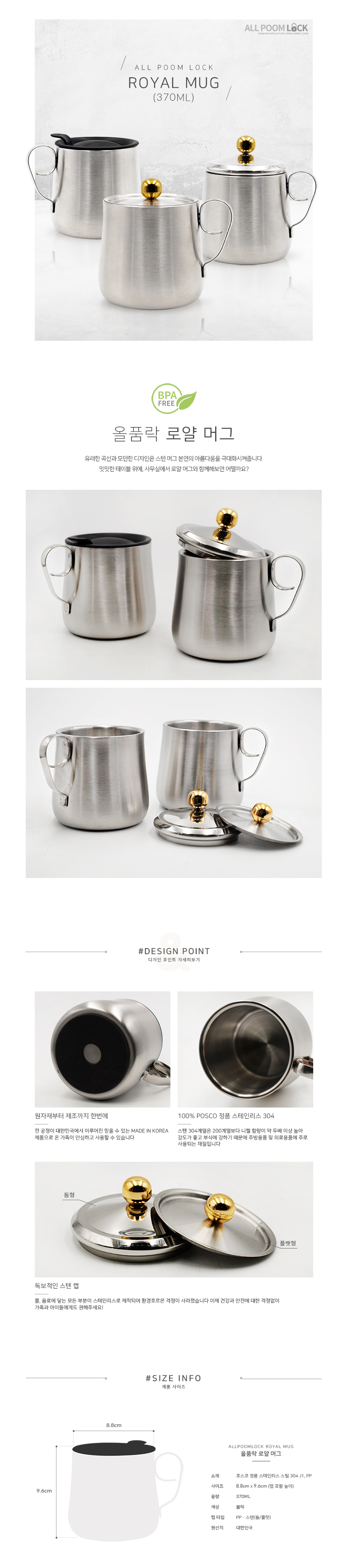 100*96mm, 370ml (하단지름*높이, 용량) / 바디 - 스테인리스 / 뚜껑 - PP