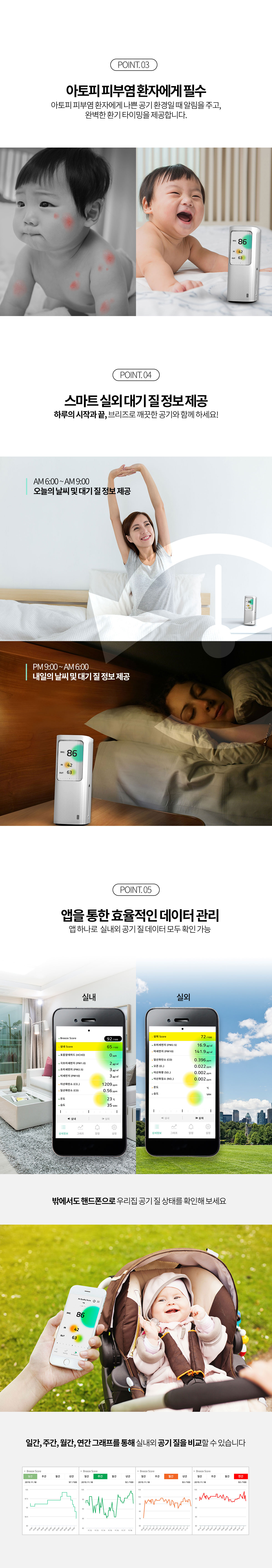8개의 센서가 탑재되어 사용자가 머물고있는 실내 및 실외의 공기질을 스마트폰 Breeze 전용 APP 을 통해 알려줍니다.