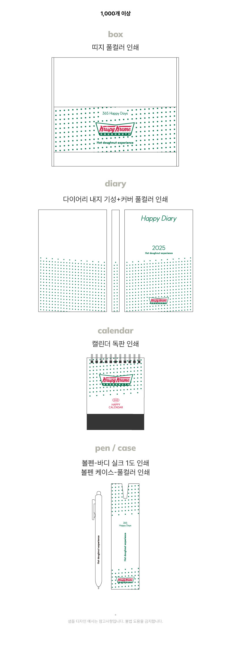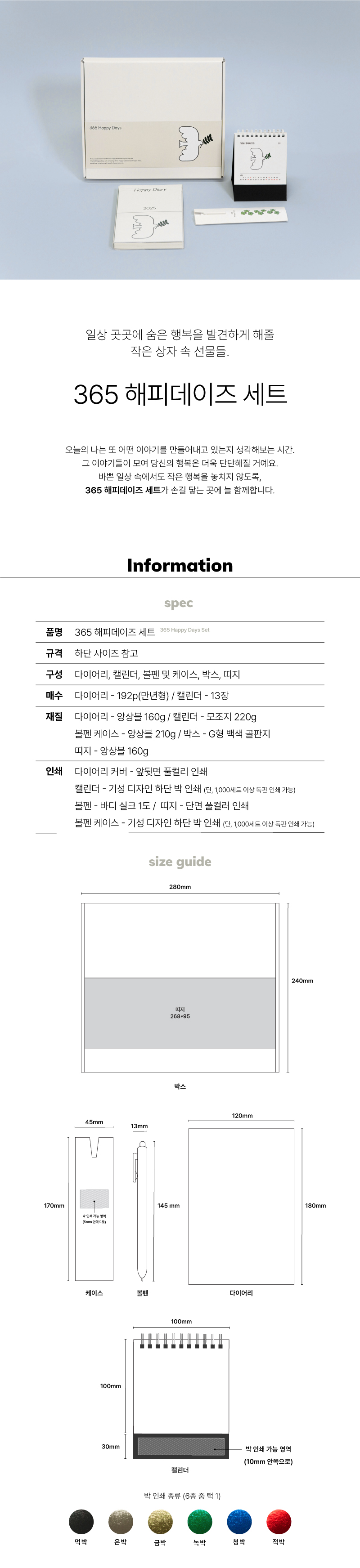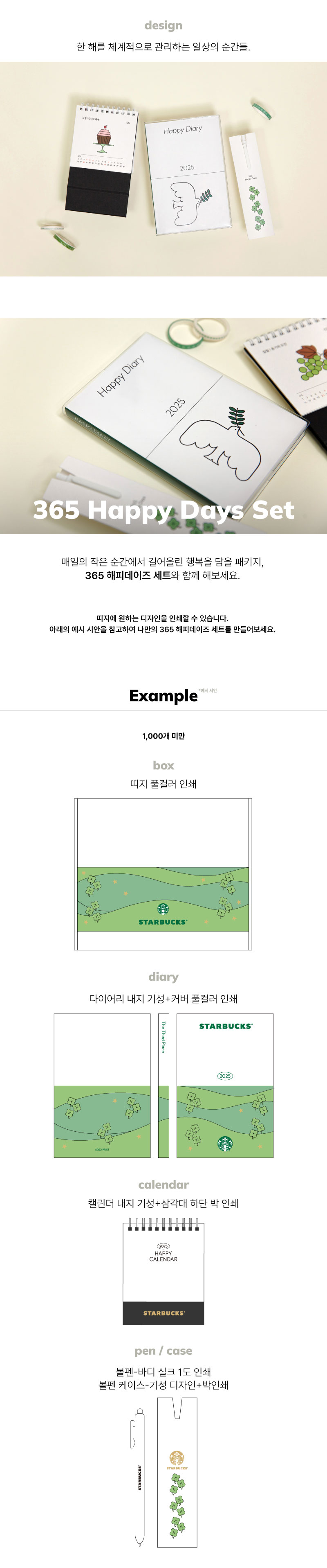 ※ 다이어리 커버-앞뒤 풀칼라인쇄 / 캘린더 삼각대 박1곳 / 볼펜-실크1도, 볼펜케이스-박1곳 / 띠지-단면 풀칼라 포함