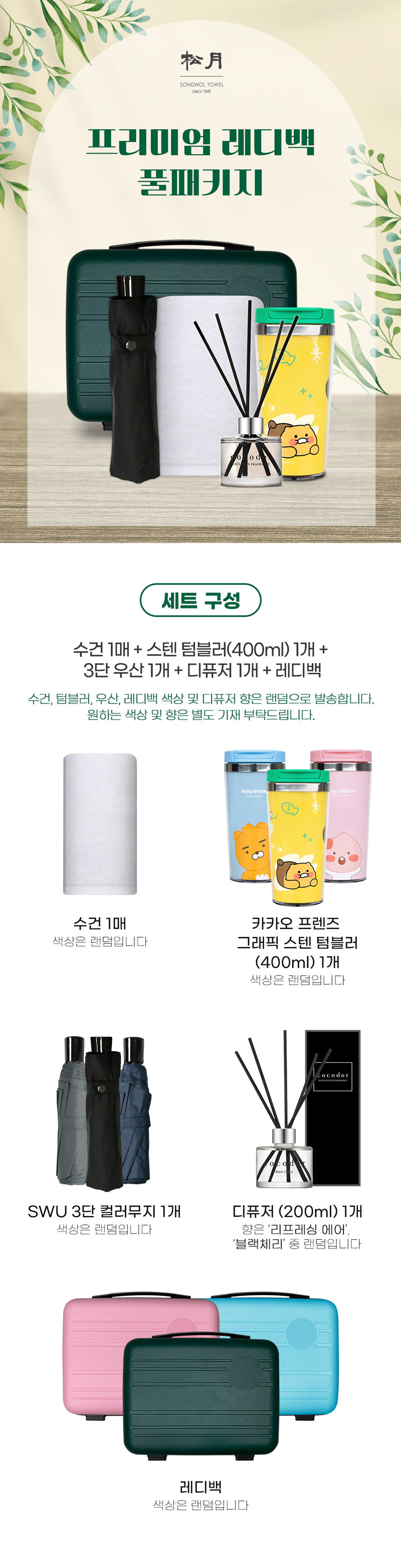 40수 160g 1매 + 카카오프렌즈 그래픽 스텐텀블러 (400ml) 1개 + 3단 SW 컬러무지 우산 1개 + 코코도르 디퓨저(200ml) 1개 + 레디백