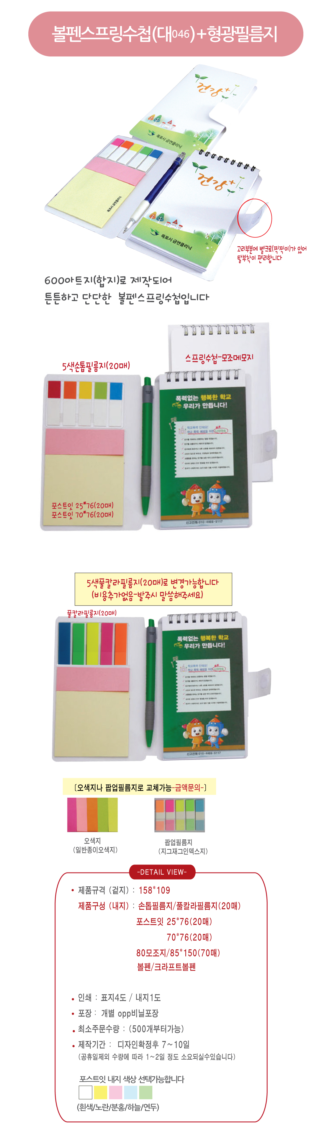 필름지+포스트잇(2종)볼펜+수첩메모지 / 포스트잇내지색상: 흰색/노란/파란/연두/분홍
